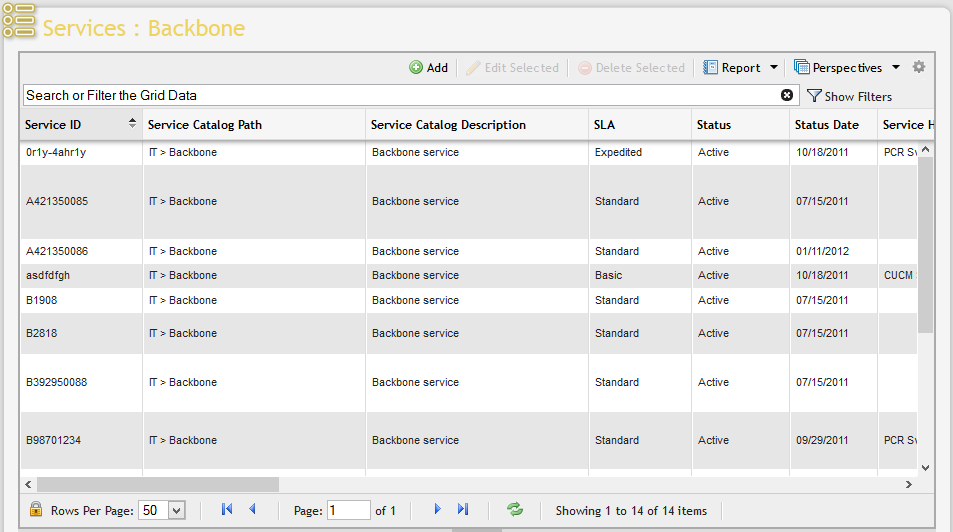 To edit an existing Backbone Service, simply double-click the item or highlight the item (single click) and press the 'Edit Selected' button located on the Grid Toolbar above the Services: Backbone grid.