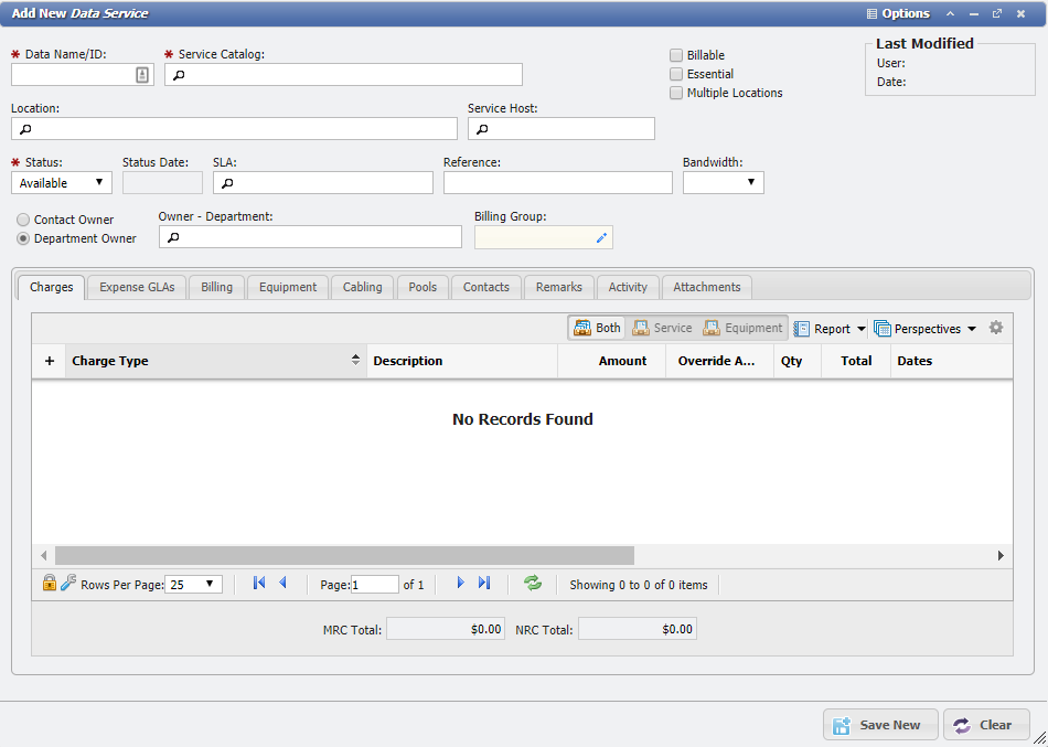 When a Service is of the Backbone type, it has the standard set of tabs on the form. The 'Tabs' associated with Backbone Services are Charges , Equipment , Contacts , Expense GLAs , Cabling , Pools , Remarks , Activity , Attachments , Billing , User Defined Fields .