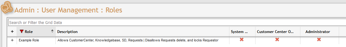 Now Users can be added to the "Example Role" and the Administrator knows that any User with a Role of "Example Role" are limited to only the sections that were set for it. Using this method of incremental Permissions Sets an Administrator can effectively and quickly manage the User Roles. For instance, now that Example Role is set with its Permissions Sets, suppose another Role is needed with only access to the CustomerCenter and Knowledgebase. It becomes a simple matter to create a new Role, "Example Role Two" and assign to it the Permissions Sets of 'CustomerCenter Only' and 'Knowledgebase' only. In this way, the previous Role of "Example Role" is unaffected by the need to create a second Role while the Admin can re-use previously created Permissions Sets.