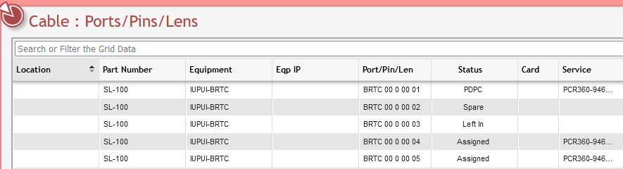 Users can navigate to the 'Ports/Pins/Lens grid' by following this path: Main > Cable > Ports/Pins/Lens. A grid displaying all PPL present in the system, the equipment each PPL originates from, and the equipment (if any) to which each PPL is connected. The PPL grid will allow the User to review any of the Ports, Pins, or Lens (PPL) associated with a given Cabling Equipment record. Since Ports/Pins/Lens (PPL) must be associated with an Equipment record they cannot be added from this grid and must be added to the Equipment record on the Ports/Pins/Lens tab instead. For more information please see the Ports/Pins/Lens grid page.