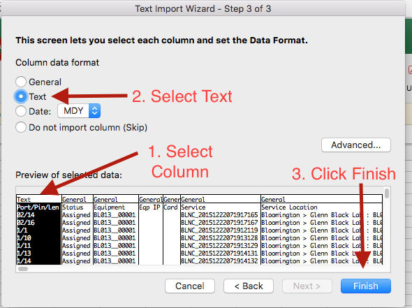 Finally, make sure the Port/Pin/Len column is highlighted and choose “Text”, then click “Finish”.