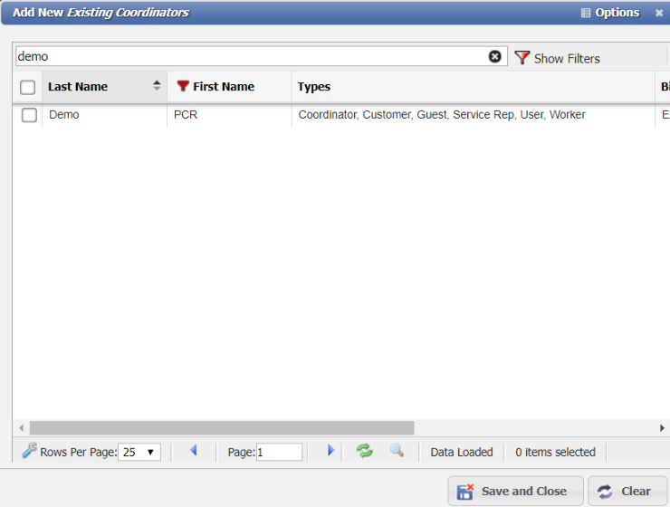 Select the Coordinator(s) that should be associated with the Department Hierarchy. The filters and search bar can help limit the results to find the Coordinator desired.