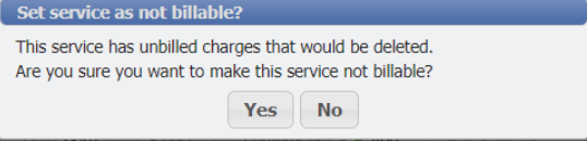 If there are charges on the Service, with incomplete Billing, the Billable flag should be checked. Attempting to clear the flag will cause PCR-360 to prompt "Set service as not billable?" with a Yes/No option. Yes, will deselect the billable flag and delete the Unbilled Charges, No, will keep the billable flag.