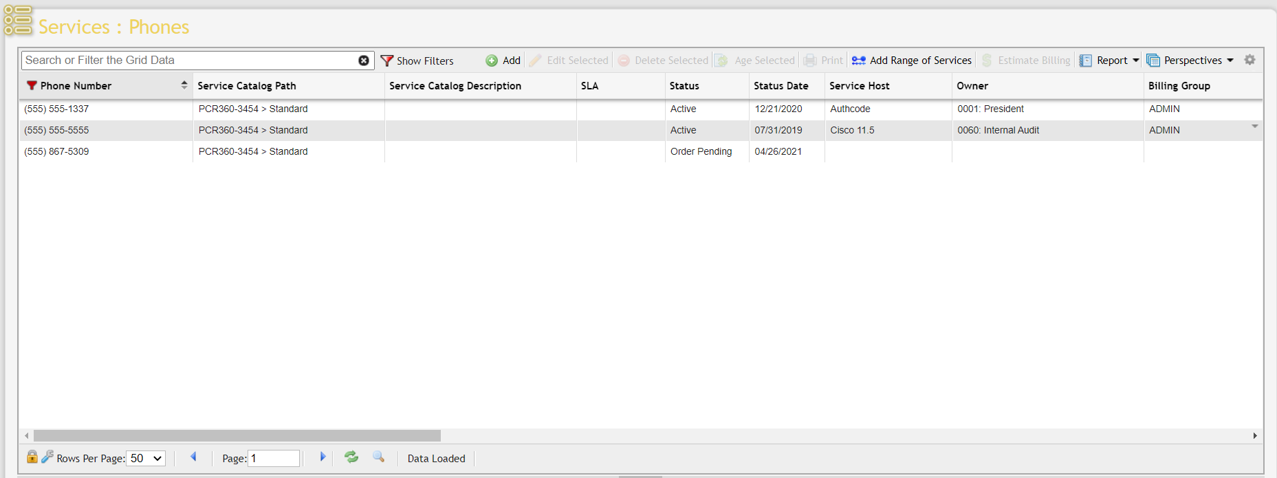 To delete an existing Phone Service, simply highlight the item(s) to be removed and click the 'Delete Selected' button located on the Grid Toolbar above the Phone Services grid.
