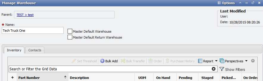 The Inventory Warehouse serves as a one-stop shop for managing all of the Equipment in your organization in a precisely controlled manner. With the Warehouse feature, you can set up multiple Warehouses, see the Location of the Warehouse, what Equipment it houses, and even access a list of all the contacts associated with the facility or its Equipment. A Warehouse must be a physical Location but can be associated with a mobile unit, like a technical repair truck. This provides enormous flexibility for tracking of Equipment when storing or moving it between Locations.
