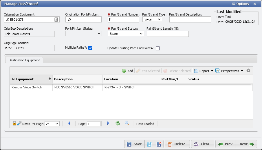 Users can navigate to the 'Pairs/Strands grid' by following this path: Main > Cable > Pairs/Strands. This grid displays all Pairs/Strands present in the system, the cable each Pairs/Strands originates from, and the equipment (if any) to which each Pairs/Strands is connected to. This allows for much quicker location of troublesome cables and hot spots along the network. Additionally, the Pairs/Strands grid will allow the User to edit or delete Pairs/Strands.