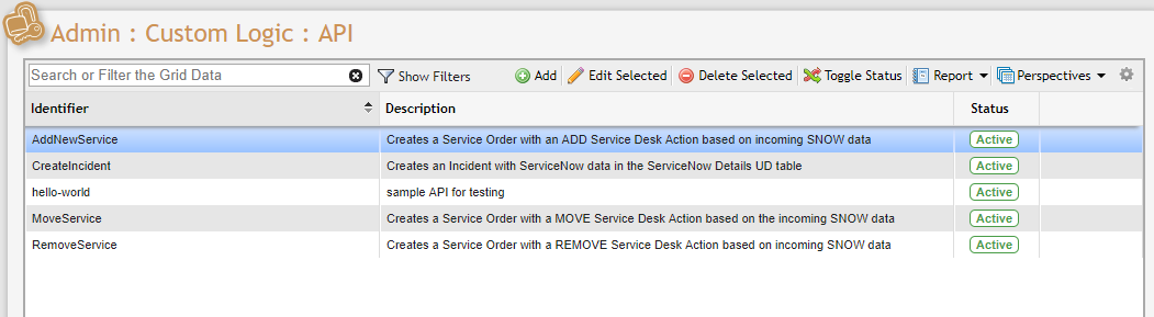 This Grid allows Users to add custom API calls.