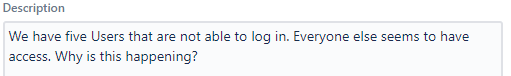 For example, "We have five Users that are not able to log in. Everyone else seems to have access. Why is this happening?".