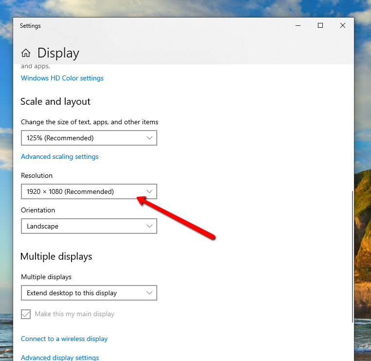 2. In the Display Settings scroll down to the Resolution Section to view the current Resolution. You can also change the Resolution by clicking the arrow to view all the available resolutions that you can select.