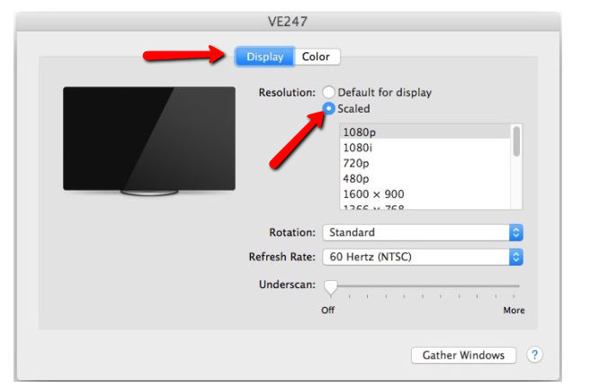 3. From the Displays Menu select the Scaled Radio Button to view the current Screen Resolution as well as change it.
