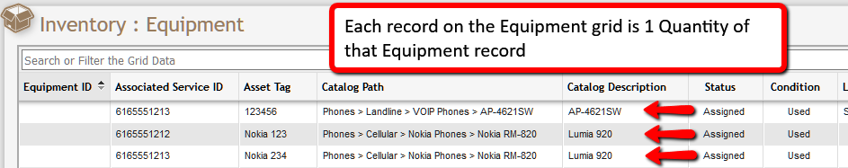 As a general rule, Equipment that is sold as a single item should be a Quantity Inventory item. A few good examples might be a phone set, cable box, switch, rack, desk, or a server. Each of these example items is a singular, discrete item that can and at times should be tracked individually throughout PCR-360 with an Owner, Location, associated Service, etc. Anything that should be tracked by an Asset Tag, Equipment ID, Serial Number, or some other identifier should always be a Quantity Equipment record. One easy way to remember the distinction is that ALL Equipment records have a Quantity, which may or may not have Units attached to it.