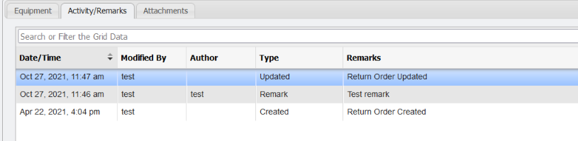 Return Order Activity/Remarks