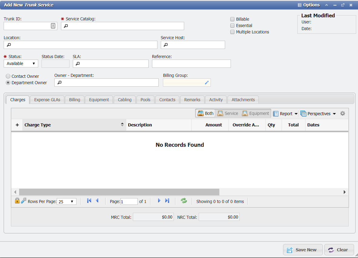 When a Service is of the Trunk type, it has the standard set of tabs on the form. The 'Tabs' associated with Trunk Services are Charges, Expense GLAs , Billing , Equipment, Cabling, Pools, Contacts, Remarks, Activity, Attachments, User Defined Fields .