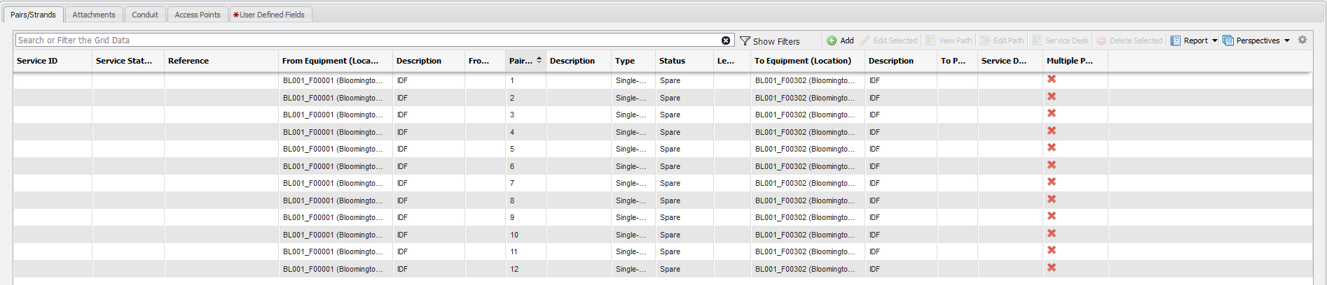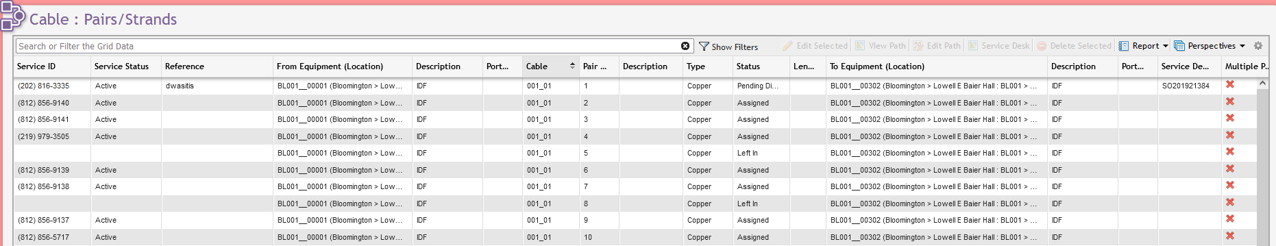 Users can navigate to the 'Pairs/Strands grid' by following this path: Main > Cable > Pairs/Strands. This grid displays all Pairs/Strands present in the system, the cable each Pairs/Strands originates from, and the equipment (if any) to which each Pairs/Strands is connected to. This allows for much quicker location of troublesome cables and hot spots along the network. Additionally, the Pairs/Strands grid will allow the User to edit or delete Pairs/Strands.