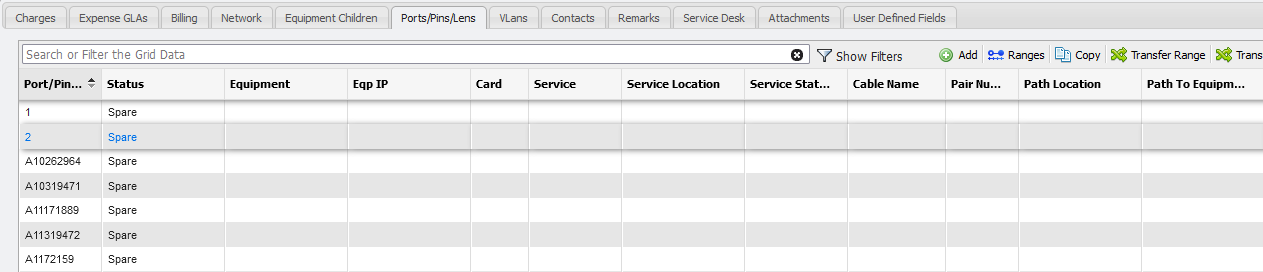 Users can navigate to the 'Ports/Pins/Lens Equipment grid' by following this path: Main > Inventory > Equipment > Ports/Pins/Lens. If a piece of Equipment has an Equipment Catalog that has the Cabling Equipment flag checked, then it will also have a tab labelled Ports/Pins/Lens. For more information please see the Inventory - Ports/Pins/Lens page.