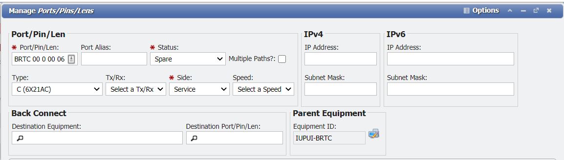 Users can navigate to the 'Ports/Pins/Lens Form' by following this path: Main > Inventory > Equipment > Ports/Pins/Lens > Add or Edit. The PPL form allows for adding and editing of individual PPLs. For more information please see the Ports/Pins/Lens form page.