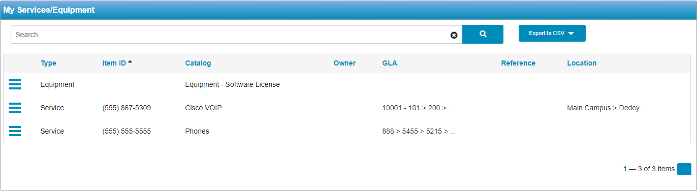 On the homepage of CustomerCenter, there is a "My Services/Equipment" Grid that displays information about the Services and Equipment that you own. In the far left column, there is a menu icon for each Service/Equipment in the Grid. Through this menu, you can perform certain administrative tasks on that Service/Equipment. The menu is composed of three options: Create Incident, Change, and Remove. To report a problem, click on "Create Incident". To create a Change Request for that Service/Equipment, click on the "Change" option or click on the "Remove" option to create a Request to remove that Service/Equipment.