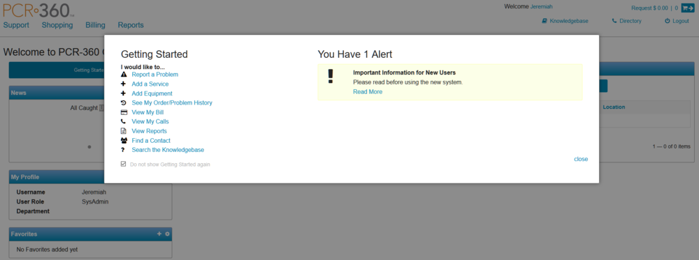 The homepage is comprised of several modules focused on alerting the User to any News and Announcements as well as managing any Services or Equipment that are owned by the User.