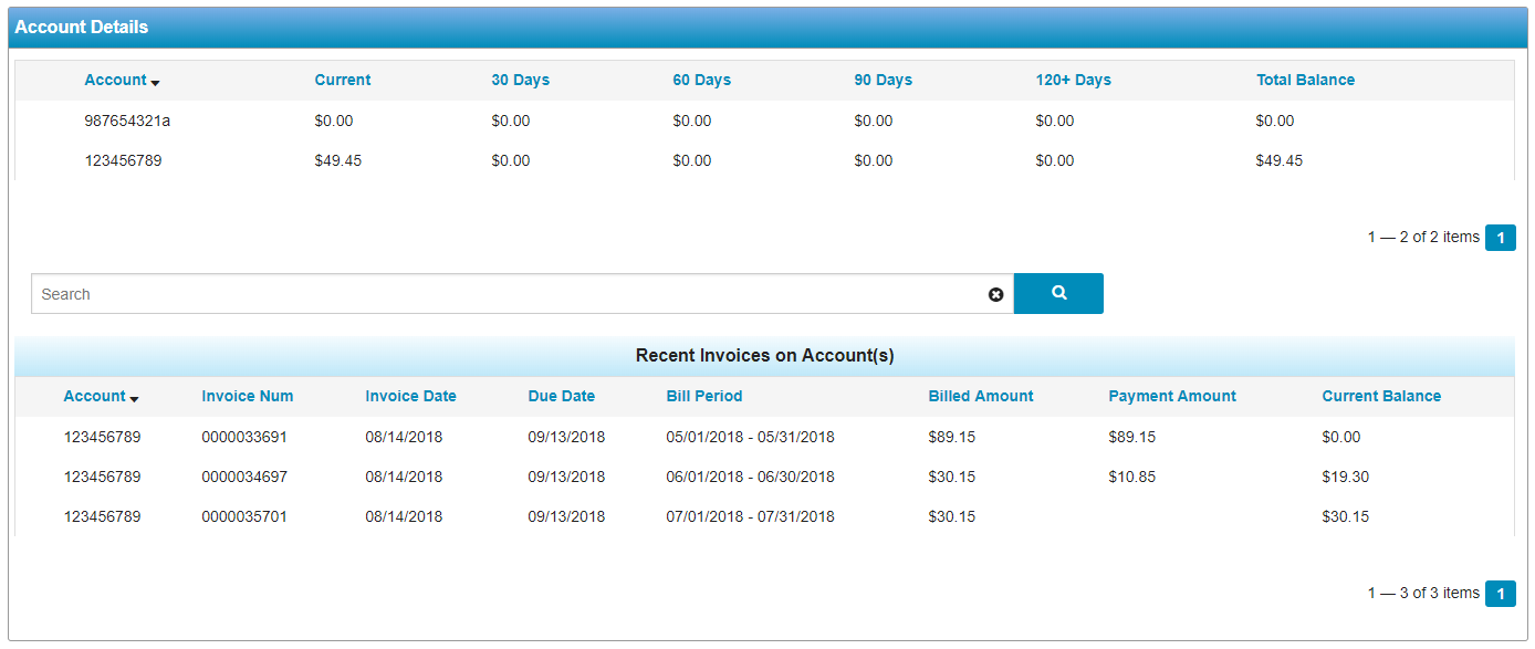 The top part of Account Details displays a listing of each GLA for which logged-in User is listed as Primary Contact. It shows the monthly totals for each of those accounts and a Total Balance.