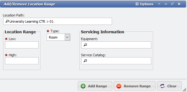 button in the toolbar at the top of the main Locations Grid. In the form, there are three required fields that are the minimum requirements for creating or removing a range of Locations: 'Low', 'High' and 'Type'.