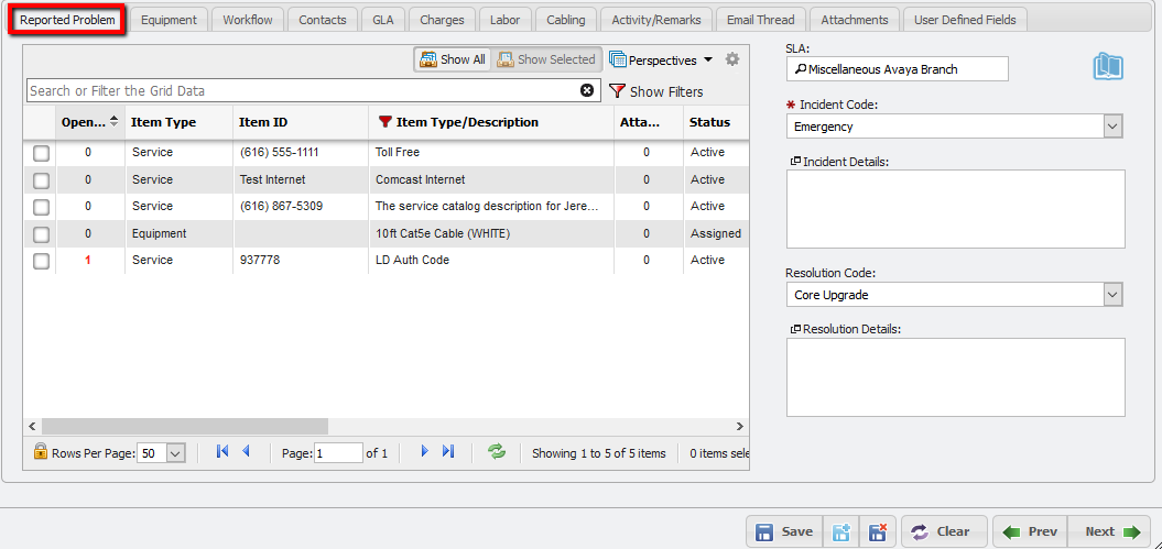 In the grid within this tab, the User can see each piece of Equipment or Service currently owned or in use by the specified Owner/Contact. This allows Users to identify the scope of the Incident and consider how it might affect the other Services and Equipment being used by the Owner/Contact.