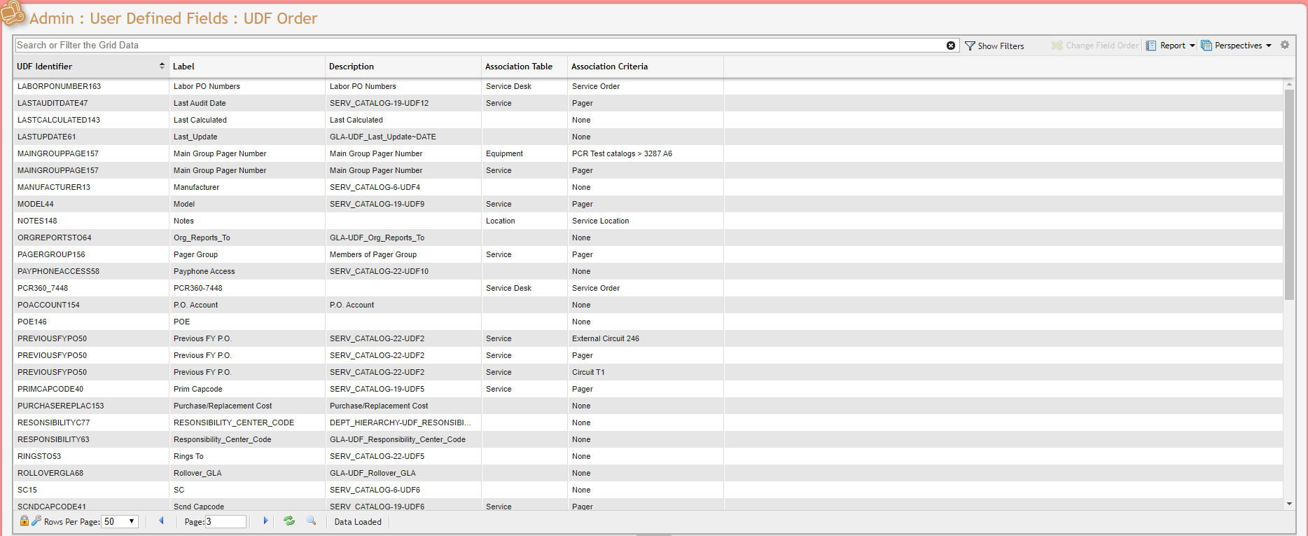 All of the UDFs that are created can be searched and sorted here. To alter the order in which they appear on their respective tabs, the User only needs to locate the appropriate UDF in the grid and click the